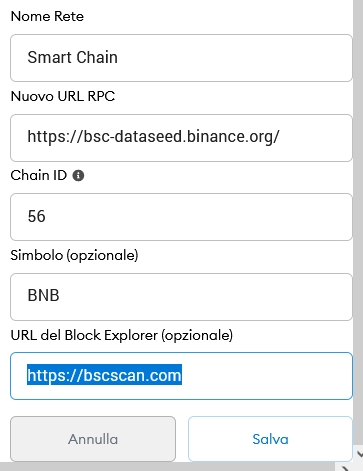 Network Name: Smart Chain New RPC URL: https://bsc-dataseed.binance.org/ ChainID: 56 Symbol: BNB Block Explorer URL: https://bscscan.com